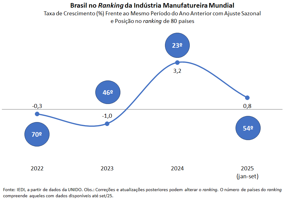 Com isso, acumulamos variação de apenas +0,8% em jan-set/25, implicando uma queda no ranking da indústria mundial da 23ª posição em 2024 para a 54ª em 2025.