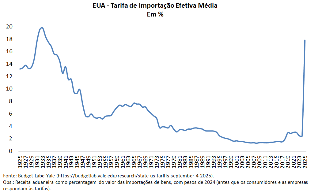 Nos EUA, o aumento de tarifas – que chegaram a 17,4% em termos efetivos, o nível mais elevado desde 1935 – se dá pela flexibilização do uso de dispositivos legais dos anos 1960-70 em um quadro de grande incerteza e contestação jurídica.