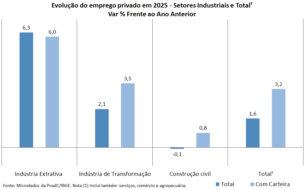 Enquanto o emprego no setor privado cresceu +1,6% em 2025, na indústria de transformação o avanço foi de +2,1%, chegando a +3,5% com carteira assinada.